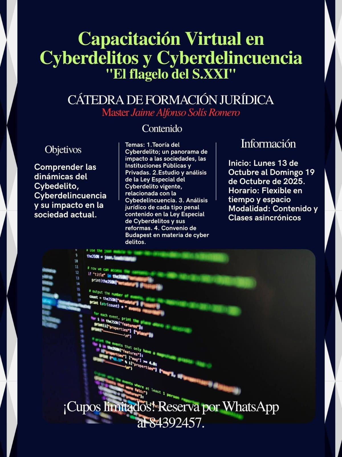 La Capacitación Virtual en Cyberdelitos y Cyberdelincuencia: “El flagelo del S. XXI” tiene como propósito brindar a los participantes una comprensión sólida sobre las dinámicas del cyberdelito y la cyberdelincuencia, analizando su impacto en la sociedad contemporánea y en las instituciones públicas y privadas.